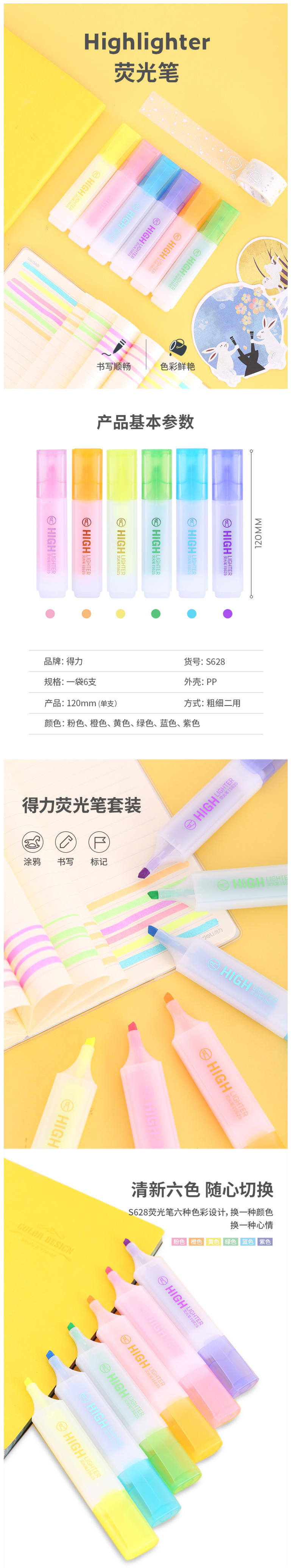 得力(deli)彩色荧光笔水性记号笔手账涂鸦笔重点标记笔6色/袋S628 自营