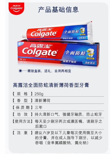 高露洁(Colgate)全面防蛀清新薄荷牙膏250g含氟牙膏强健牙釉质 自营