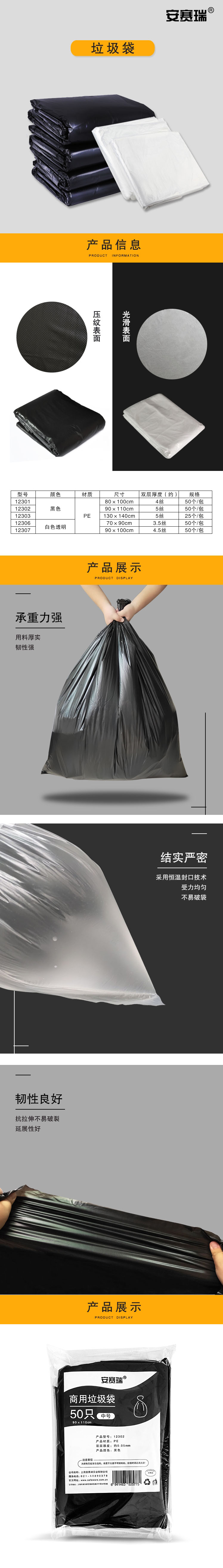安赛瑞12306加厚商用透明垃圾袋平口70×90cm(50只装) 自营
