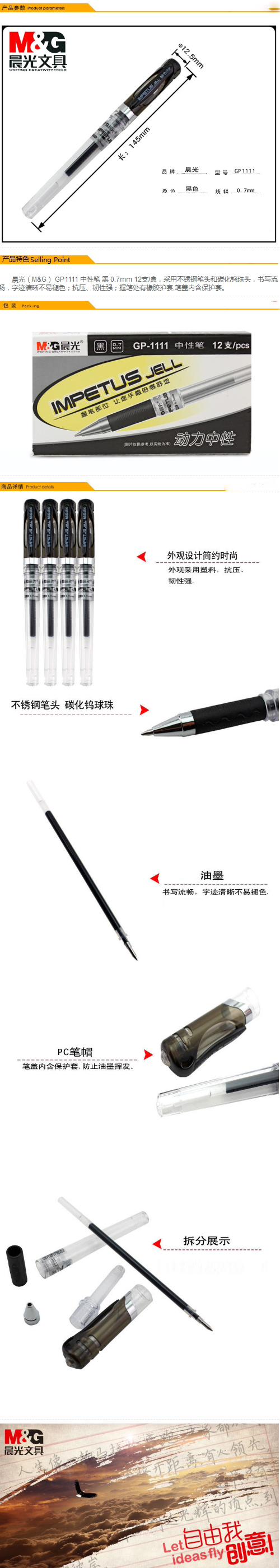 晨光GP-1111大容量拔帽式签字笔.7mm12支/盒(黑色) 自营
