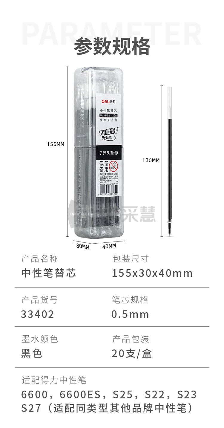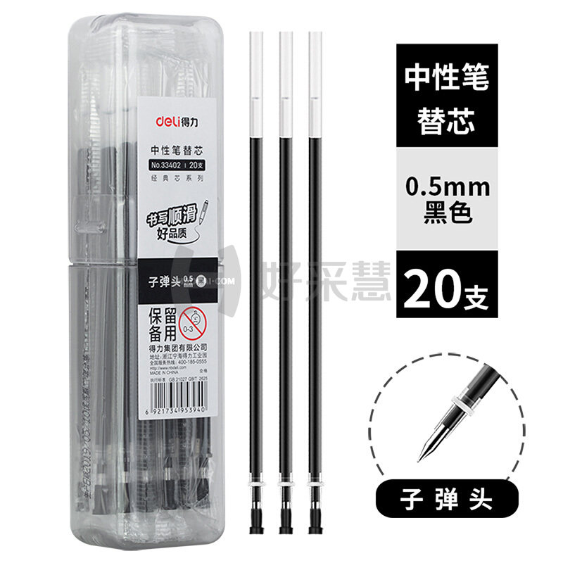 得力(deli)33402笔芯.5mm中性笔芯签字笔水笔替芯办公用品子弹头黑色20支/桶(单位:盒) 自营