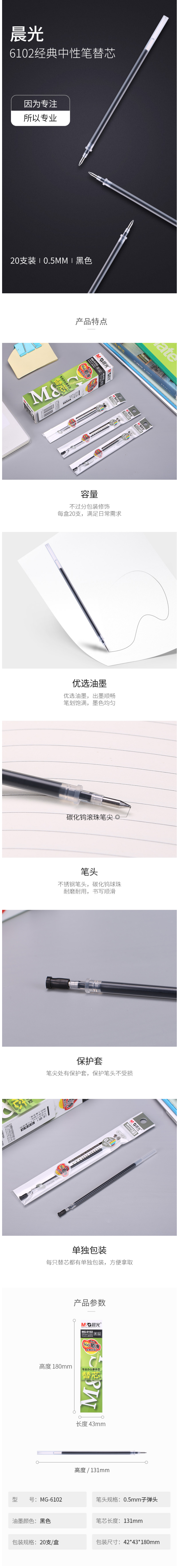 晨光(M&G)MG-6102办公型中性替芯笔芯.5mm黑色20支/盒 自营
